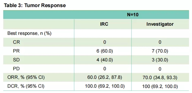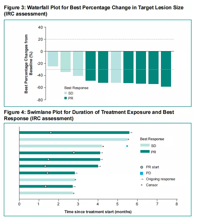 这项临床试验的10例患者都取得了很好的疗效,在数据截止日期(2021年6月4日),独立审查委员会 (IRC)确认的ORR为60.0%,6名患者获得部分缓解(PR),4名患者达到稳定疾病(SD),研究者评估的ORR为70.0%。疾病控制率为100%。