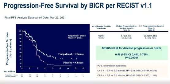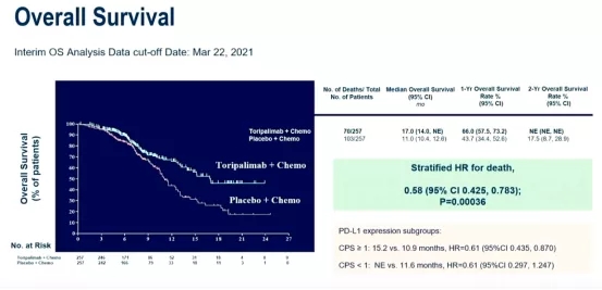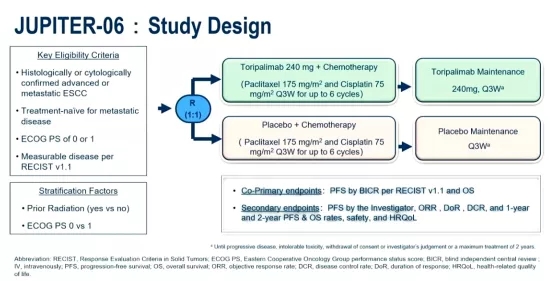 Rui-Hua Xu, et al. JUPITER-06: A randomized, double-blind, phase III study of toripalimab versus placebo in combination with first-line chemotherapy for treatment naive advanced or metastatic esophageal squamous cell carcinoma (ESCC). ESMO 2021, Sep 16-22. Abstract 1373MO.
