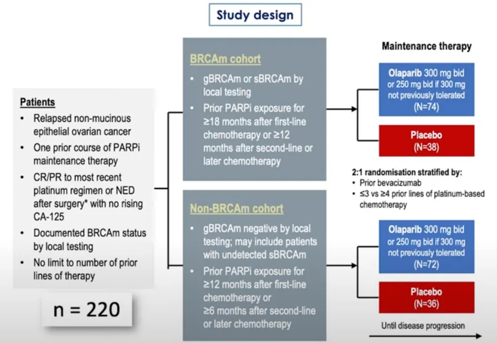 在SOLO1、PAOLA-1和PRIMA/ENGOT-OV26/GOG-3012等研究取得阳性结果后,更多的上皮性卵巢癌患者接受了PARP抑制剂(PARPi)治疗。PARPi维持治疗期间或之后疾病进展的患者,下一步治疗怎么办?OReO/ENGOT Ov-38是在这种背景下探索了PARPi维持再治疗的第一项III期研究。研究纳入非粘液性上皮性卵巢癌患者,这些患者曾接受过一种PARPi维持治疗,并且对最近接受的铂类化疗有应答(部分缓解或完全缓解),术后NED且CA-125水平没有升高。2:1随机分配接受奥拉帕利300 mg bid(或250 mg bid,若以前不能耐受300 mg)或安慰剂直至疾病进展。根据患者是否接受过贝伐珠单抗治疗、≤3次或≥4次含铂化疗进行分层。主要终点是研究者评估的PFS。