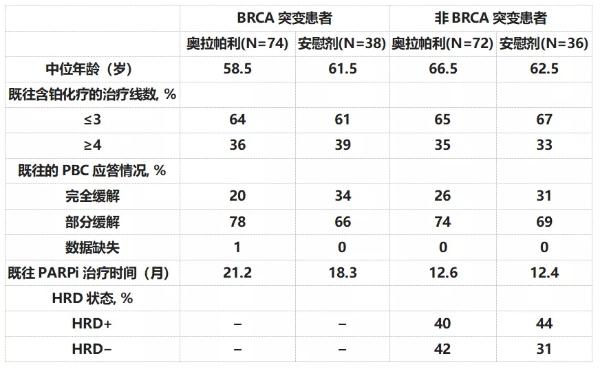 研究入组的220例患者中,112例为BRCA1/2突变型卵巢癌患者,108例为非BRCA1/2突变型。患者既往接受了多线治疗,BRCA1/2突变患者(93%)和非BRCA1/2突变患者(86%)中的大多数患者已接受≥3线化疗。BRCA1/2突变患者既往接受PARPi治疗的中位持续时间(18.3-21.2个月)长于非BRCA1/2突变患者(12.4-12.6个月)。