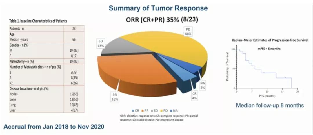 结果:2018年1月至2020年11月,共入组25例患者,其中23例开始治疗。中位年龄66岁,男性19例。最常见的转移部位是淋巴结和骨(15例和13例),其次是肺和肝(10例和4例)。中位随访时间为8个月。ORR为35%(CR 1例,PR 7例)。中位PFS为6个月。