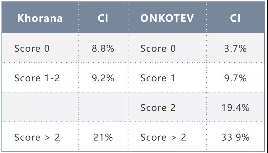 按照Khorana和ONKOTEV评分的12个月VTE累积发病率