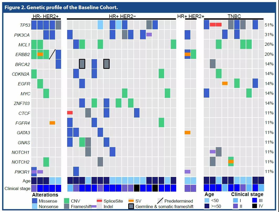 我们将35例具有基线肿瘤组织样本的复发、转移性乳腺癌患者分组为“Baseline Cohort”。如图2所示,最常见的遗传特征改变是TP53突变(51%),并在HR-患者中富集。