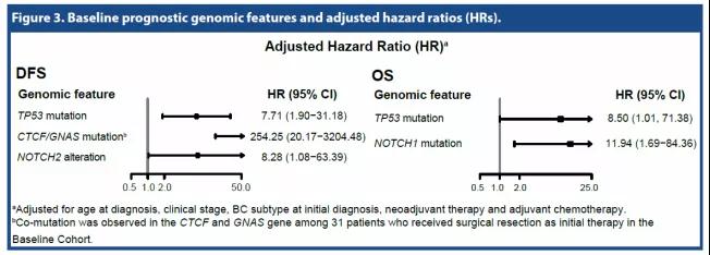1、基线肿瘤组织TP53突变、CTCF/GNAS突变、NOTCH2突变是DFS的负向预测因子;TP53突变和NOTCH1突变是OS的负向预测因子。