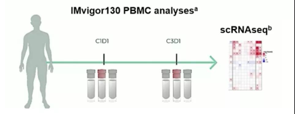 研究人员对IMvigor130研究中A组和C组70例患者,在第1周期第1天(C1D1)和第3周期第1天(C3D1)采集外周血单个核细胞(PBMC)进行单细胞RNA测序(scRNA seq),通过基因谱表达评价治疗前后顺铂(Cis)或卡铂(Carbo)诱导的肿瘤微环境(TME,n=113)变化。