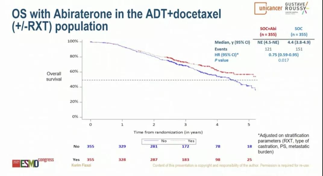 结果:中位随访时间为4.4年(ADT+多西他赛人群中有273例死亡事件)。阿比特龙对OS的影响与RXT对OS的影响没有相互作用(P=0.82)。因此,可以将阿比特龙组进行汇总比较。在总体人群(SOC为ADT或ADT+多西他赛)中,联合阿比特龙可显著改善OS(5.7 vs 4.7年;HR 0.83,95%CI:0.69~0.99,P=0.034);在ADT+多西他赛人群中,联合阿比特龙同样可显著改善OS(NR vs 4.4年;HR 0.75,95%CI:0.59~0.96,P=0.021)。