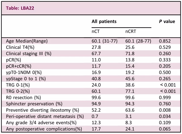 结果:纳入符合入选标准的663例患者(nCT组331例,nCRT组332例)。nCT组86.3%的患者完成了全剂量的新辅助治疗,而nCRT组为91.0%(P=0.074)。nCT组中52.8%的患者完成了全剂量的辅助化疗,而nCRT组为44.1%(P=0.065)。nCT组和nCRT组的pCR率和良好降期(ypStage 0~1)率分别为11.0% vs. 13.8%(P=0.333)、 40.8%和45.6%(P=0.265)。与nCRT相比,nCT显著降低了围手术期远处转移(0.7% vs. 3.1%,P=0.034)。nCT组2例患者和nCRT组5例患者获得了完全的临床缓解,未进行手术治疗。nCT组预防性回肠造口较少(52.2 vs. 63.6,P=0.008)。两组有相似的短期毒性和术后并发症。在亚组分析中也观察到类似的结果。