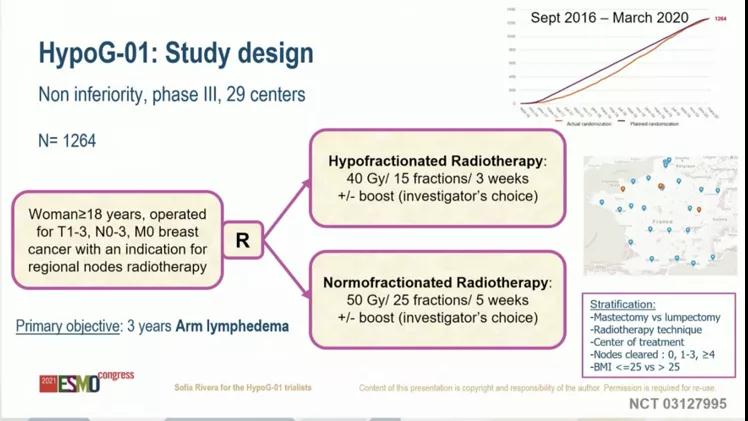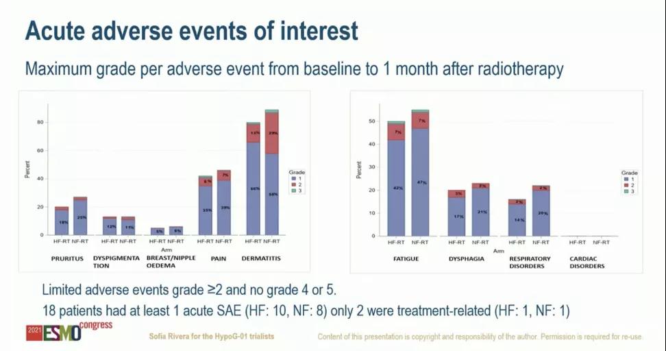 从2016年9日至2020年3月,法国29个地区招募了1265名女性,其中HF-RT组:633名,NF-RT组:632名。所有患者(中位年龄:58岁)接受并完成了他们预定的放射治疗并结束随访。急性3级毒性在两个治疗组中均很罕见(HF-RT5.4%,NF-RT5.7%),且未观察到4-5级毒性。