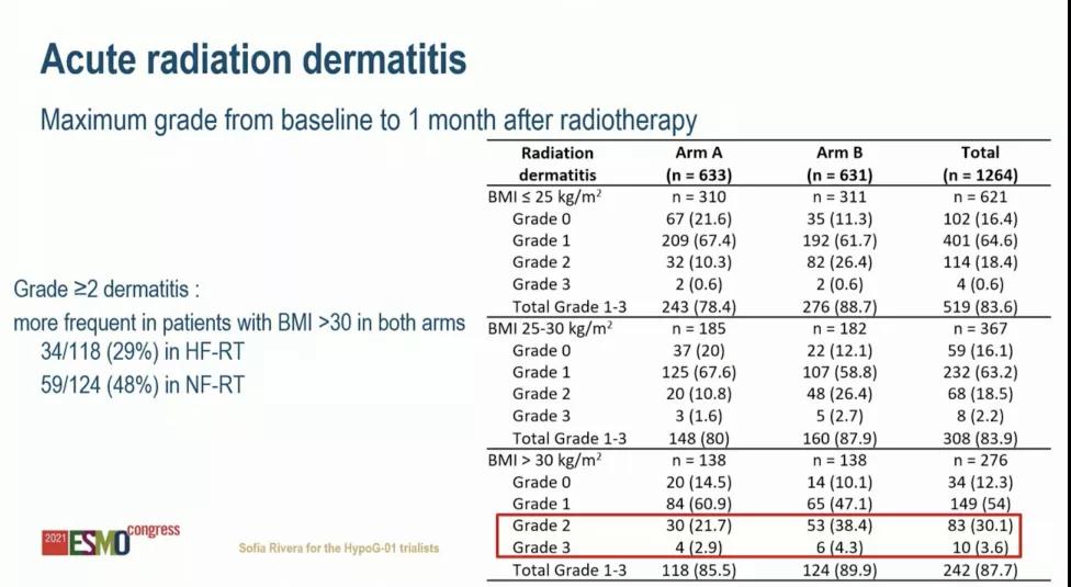 HF-RT的总体2级或更高的急性毒性发生率(38.4%)低于NF-RT组(48.1%)。BMI≥30患者中,2级或以上的皮炎更常见:HF-RT为34/118(29%),NF-RT为59/124(48%)。共有18例患者经历了至少1例急性严重不良事件(HF-RT:10、NF-RT:8),其中只有2例被认为与治疗相关(HF-RT:1、NF-RT:1)。