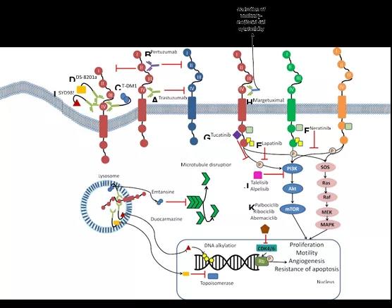图1:目前研发的抗HER2靶向治疗药物及机制概览:(A)曲妥珠单抗(绿色),与人表皮生长因子受体2(HER2)的胞外近膜亚结构域IV结合,导致HER2信号传导抑制;(B)与HER2亚结构域II结合的帕妥珠单抗(紫色),阻止与HER2和HER3的同源二聚化和异源二聚化;(C)T-DM1,一种抗体-药物偶联物(ADC),其中曲妥珠单抗与微管抑制剂emtansine连接,在细胞内溶酶体吞噬ADC后释放emtansine部分(蓝色圆圈);(D)DS-8201a(曲妥珠单抗deruxtecan),另一种ADC,结合曲妥珠单抗和强效拓扑异构酶i抑制剂deruxtecan(橙色矩形);(E)拉帕替尼,其为HER1和HER2的可逆性酪氨酸激酶抑制剂(TKI),抑制下游信号通路,包括PI3K、Akt和Ras/Raf/MEK/MAPK;(F)neratinib(绿色方块),另一种TKI,抑制HER1、HER2和HER4;和(G)tucatinib(紫色),一种特异性HER2 TKI。试验性治疗包括:(H)Margetuximab,一种将曲妥珠单抗与改变的FCγ结构域结合的ADC,导致T细胞活化和抗体介导的细胞毒性;(I)SYD985,一种结合曲妥珠单抗和duocarmazine的ADC,一种DNA烷化剂,导致细胞增殖减少;(J)PI3K抑制剂taselsib和alpelisib;和(K)细胞周期蛋白依赖性激酶4(CDK4)和CDK6抑制剂(palbociclib、ribociclib和abemaciclib),所有这些都是研究替代下游靶标的临床试验的一部分。
