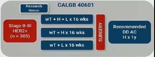 CALGB 40601是一项新辅助研究,探索新辅助治疗单靶及双靶的疗效问题,最终经过7年多的随访,HL(曲妥珠单抗联合拉帕替尼)组比其他治疗组有明显的RFS和OS获益。