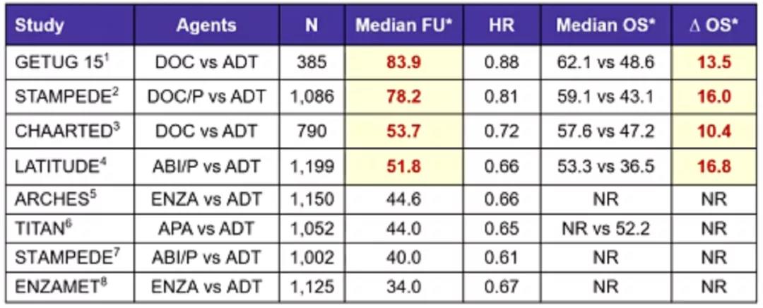 纵观已经报道的mHSPC强化治疗相关研究来看,ARCHES研究与CHAARTED研究、LATITUDE研究,TITAN研究以及多期多臂的STAMPEDE研究数据相差不是太多,毕竟都是在ADT基础上进行不同类型的强化治疗。但是整体上,恩扎卢胺等新型内分泌治疗的OS数据还不成熟。