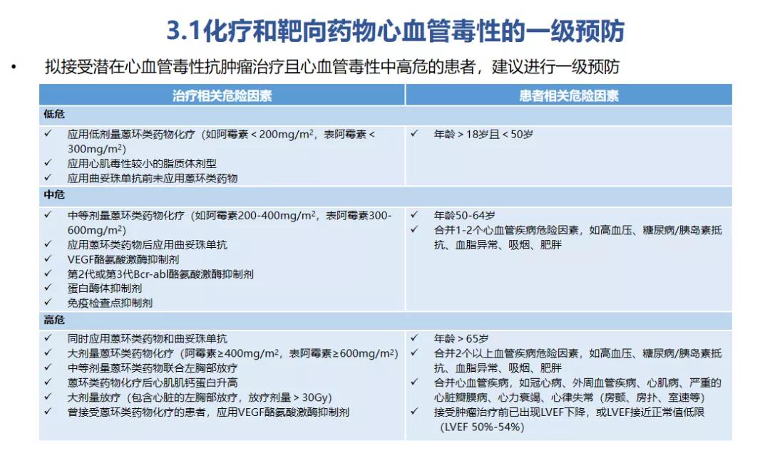 方凤奇教授:一级预防也是本指南的一大特点,该指南建议对拟应用具有潜在心血管毒性的抗肿瘤治疗,且具有心血管疾病中高危因素的患者进行积极的一级预防。这些危险因素是由抗肿瘤治疗相关毒性危险因素和肿瘤患者自身相关危险因素共同构成的。