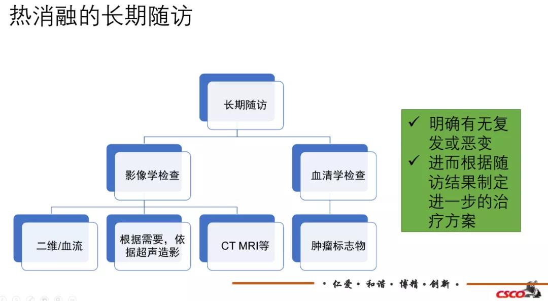 在临床实施热消融的时候,徐栋教授阐明了以下具体操作的注意事项:首先要根据消融对象的部位、范围、内部血供及与周边组织的关系来选择适当功率;其次,要注意麻醉方式与部位,进行超声诱导下的麻醉,若患者对麻醉药物过敏,则可采用针刺麻醉,并实施“液体隔离带”法予以保护;第三,在避免副损伤的前提下,尽可能达到局部根治,对于直径<1cm的淋巴结采用固定消融模式,>1cm的采用多点分次消融;第四,明确了长期随访的原则。
