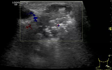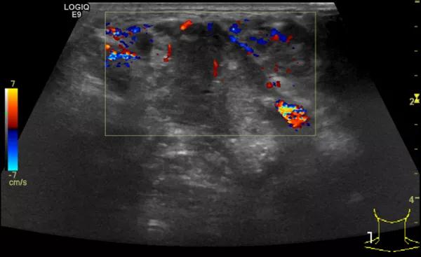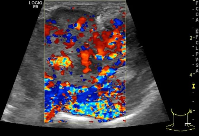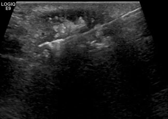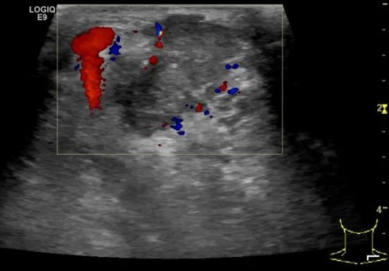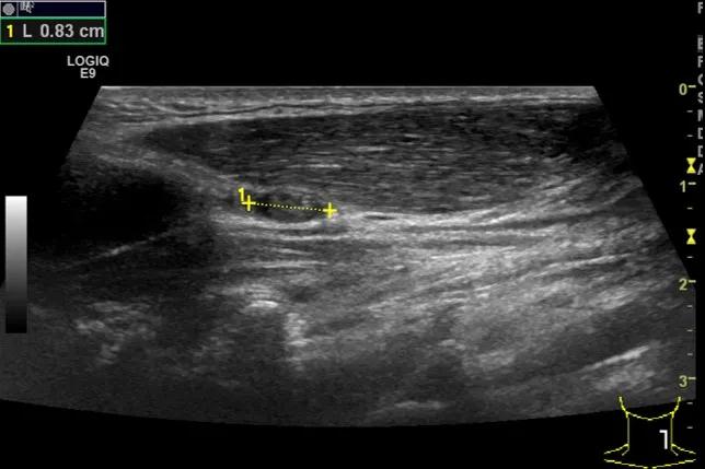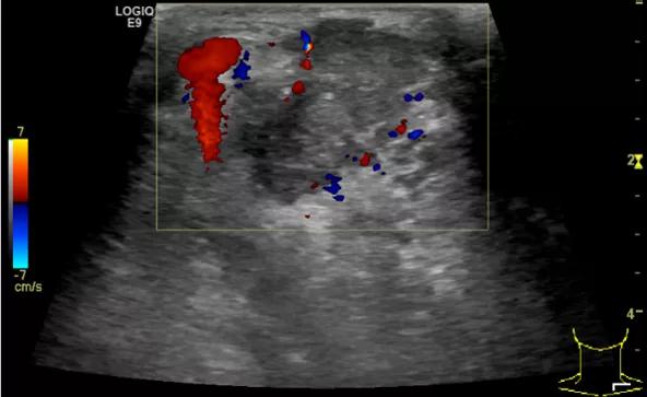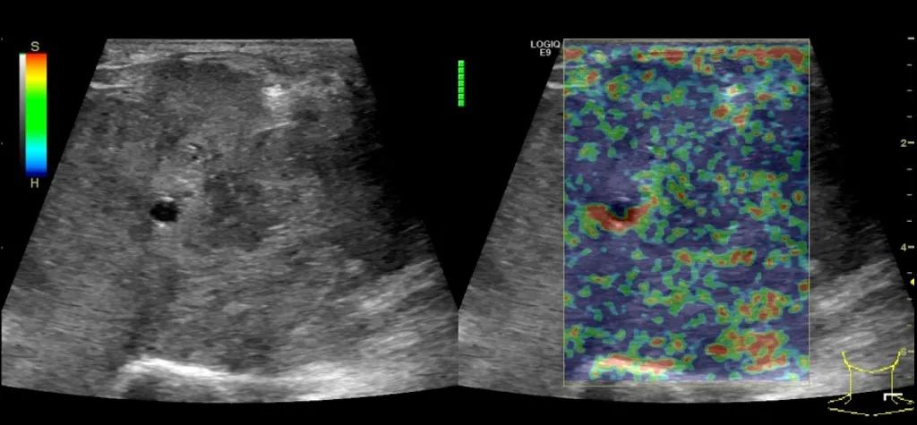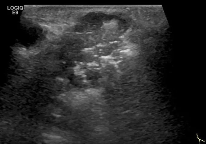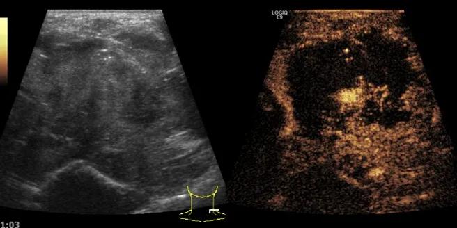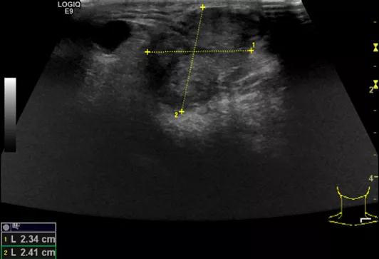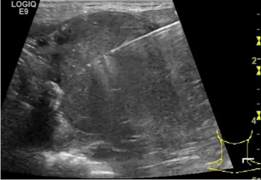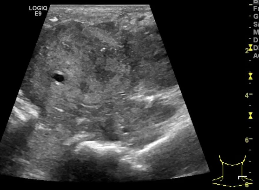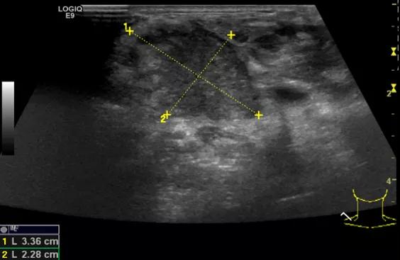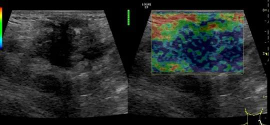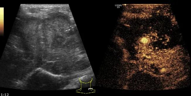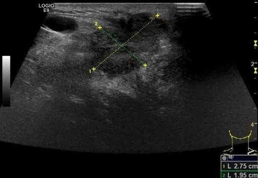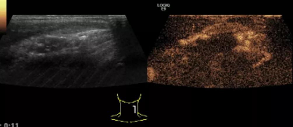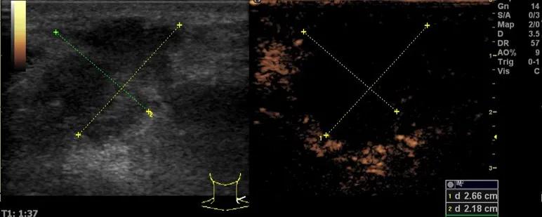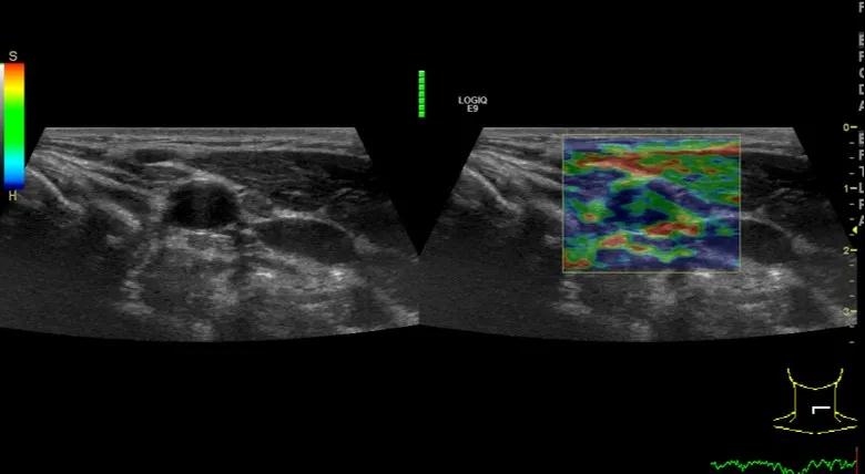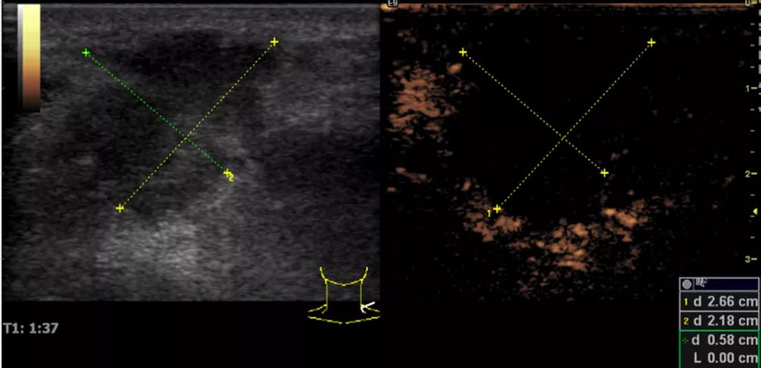 第二例是食管癌患者,术后半年余锁骨上固定淋巴结可触及肿大,疼痛非常明显,系统治疗后无缓解,患者希望通过局部处理缓解症状。造影显示强化信号明显,结节部分区域坏死,故主要针对强化区域从后向前的逐层的消融,皮下进行液体隔离减少烫伤。热消融后影像显示血流增强消失,弹性、硬度增高,一个月后复查显示充盈缺损,完全消融,疗效远超预期。