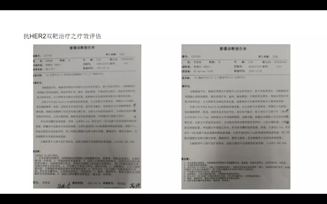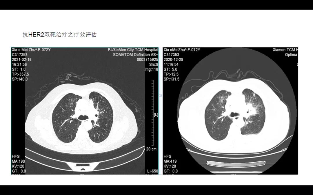 本例患者为初诊Ⅳ期肺腺癌(左胸膜转移),历经七线抗肿瘤治疗总生存期已达57个月(接近5年),其中末线“曲妥珠单抗330mg ivgtt d1+吡咯替尼320mg po d1-21,q3W”双靶联合治疗共十一周期(PFS 8个月),期间病灶一度缩小。