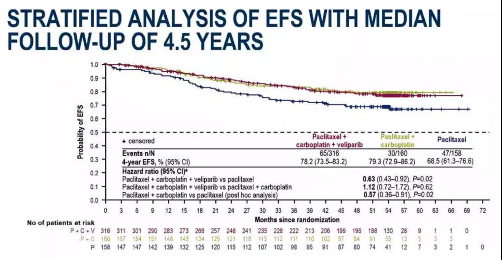 [6] Loibl?S et al. Event-free survival (EFS), overall survival (OS), and safety of adding veliparib (V) plus carboplatin (Cb) or carboplatin alone to neoadjuvant chemotherapy in triple-negative breast cancer (TNBC) after ≥4 years of follow-up: BrighTNess, a randomized Phase 3 trial. ESMO Congress 2021, Abstract 119O