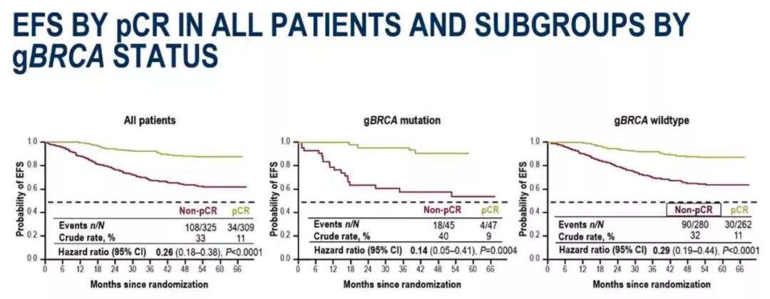 此外,研究发现,无论患者是否存在gBRCA突变,新辅助后达到pCR都提示更长的EFS(图6)。因此,研究者建议,对于II-III期的TNBC,无论gBRCA是否突变,都可以在新辅助治疗中加用卡铂