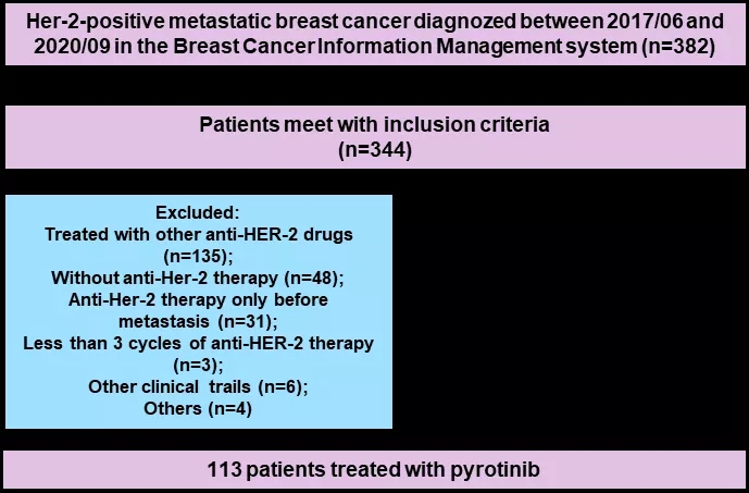 本研究从BCIMS中提取2017/06至2020/09期间诊断为HER2阳性的382名晚期乳腺癌患者,从中筛选出符合入排标准的113名晚期复发/转移性HER2阳性乳腺癌患者,均接受吡咯替尼治疗。