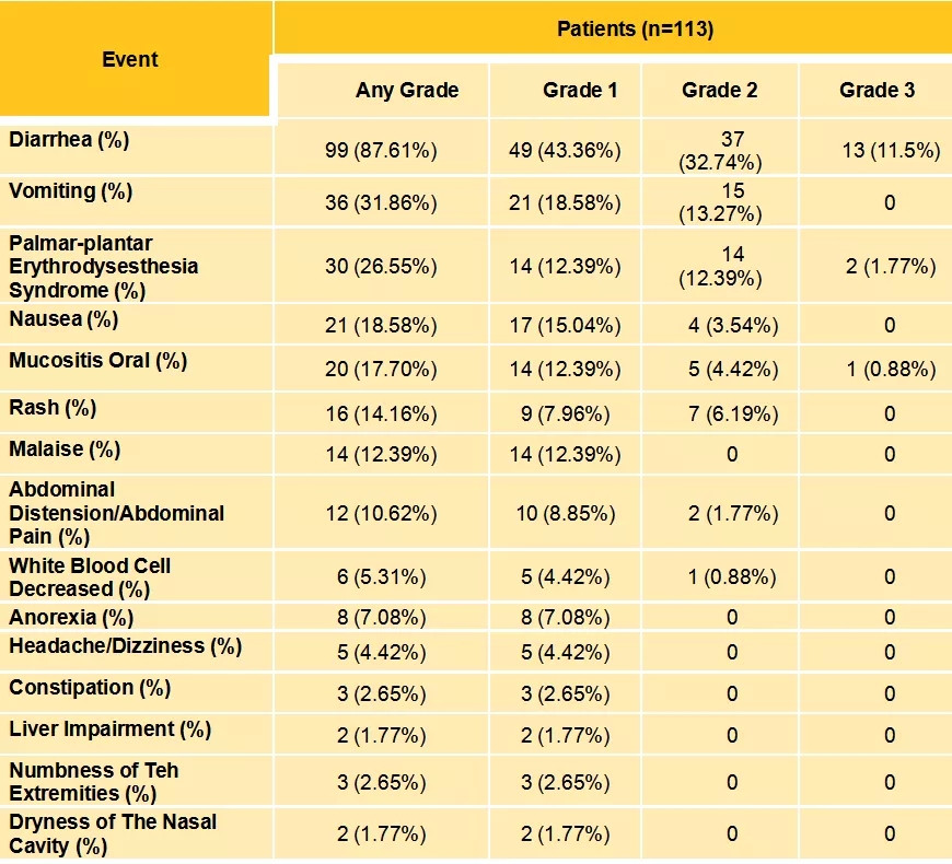 吡咯替尼最常见的不良事件是腹泻,所有级别腹泻发生率为87.6%,其中1-2级76.1%,3级11.5%,无4级腹泻发生。此外,呕吐(31.9%)、掌跖红斑综合征(26.6%)、恶心(18.6%)和口腔黏膜炎(17.7%)也是常见不良反应。