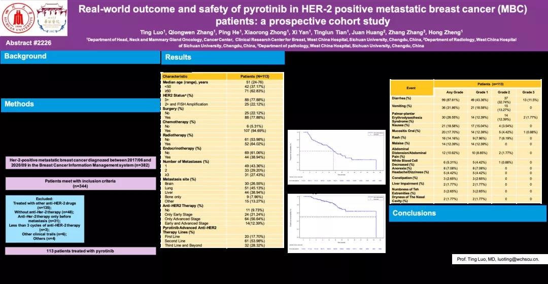 据此,四川大学华西医院头颈肿瘤科罗婷教授团队基于华西医院乳腺癌信息管理系统,纳入113例HER2阳性晚期乳腺癌患者,对吡咯替尼的疗效及安全性进行了分析,评估了总体和亚组人群的客观反应率(ORR)、无进展生存(PFS)和总生存期(OS)等预后指标,以及不良反应的发生情况,为吡咯替尼治疗晚期HER2阳性乳腺癌的预后与安全性提供了重要的高质量真实世界研究证据。该研究的部分结果以壁报形式在2021年ESMO大会上公布(e-poster number: 288P)。