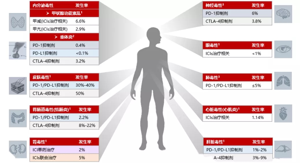 免疫检查点抑制剂(ICI)治疗所致的irAEs可累及内分泌器官、皮肤、胃肠道、肺脏、肝脏、肾脏、心脏和骨骼肌肉系统等多个系统。糖皮质激素是处理irAEs的核心,然而临床发现的部分irAEs属于激素抵抗型(steroid-refractory)的irAE。