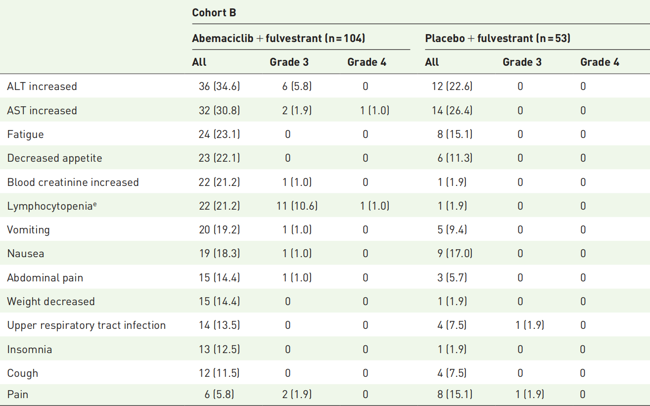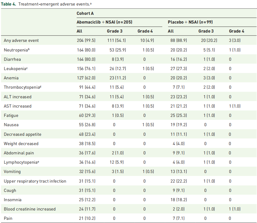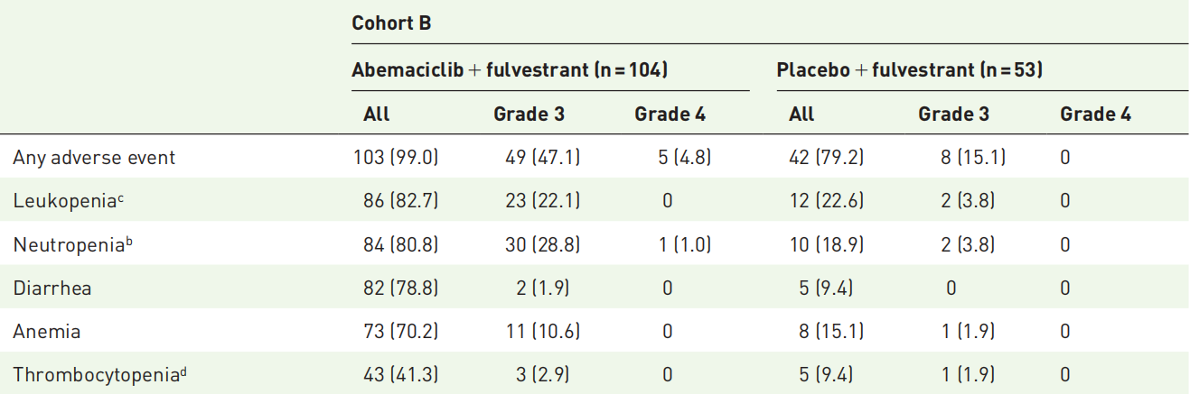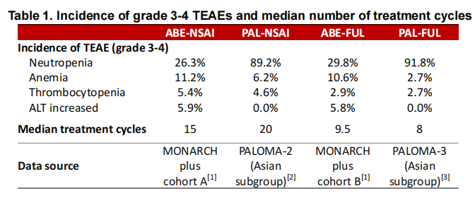 在MONARCH plus研究中,最常报道的紧急治疗相关不良事件(TEAEs)为中性粒细胞减少、腹泻、白细胞减少和贫血。大多数报告的中性粒细胞减少不良事件的严重程度为1级和2级。在阿贝西利+NSAI组中,只有1例(0.5%)患者报告出现发热性中性粒细胞减少(3级),并在接受支持治疗后恢复。因中性粒细胞减少而停止治疗的患者,在阿贝西利+ NSAI组有4例(2.0%),而阿贝西利+氟维司群组没有患者出现相应情况。