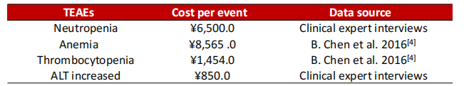 基于临床专家的意见,为避免重复计算血液学毒性相关的TEAEs治疗的费用,在中性粒细胞减少、白细胞减少、淋巴细胞减少都满足纳入条件的基础上,仅计算了中性粒细胞减少的治疗费用。