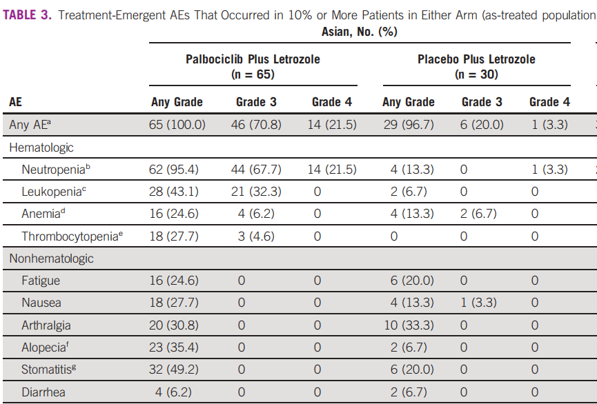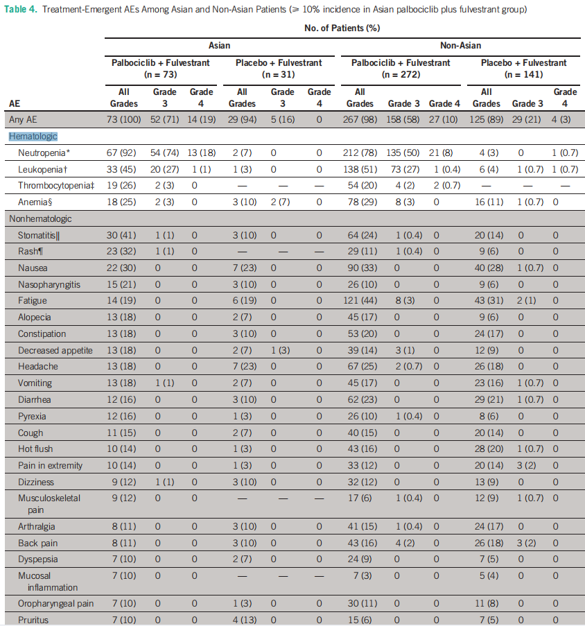在PALOMA-3研究中,哌柏西利+氟维司群的亚洲人群最常见的血液学AEs为中性粒细胞减少和白细胞减少。发热性中性粒细胞减少发生在哌柏西利+氟维司群组3例(4%)亚洲患者中,其中2例报告为严重的AE。与非亚洲人群相比,亚洲人群的疲劳发生率(分别为19% vs 44%)较低,而中性粒细胞减少(分别为92% vs 78%)、口腔炎(分别为41% vs 24%)、皮疹(分别为32% vs 11%)和鼻咽炎(分别为21% vs 10%)的发生率较高。