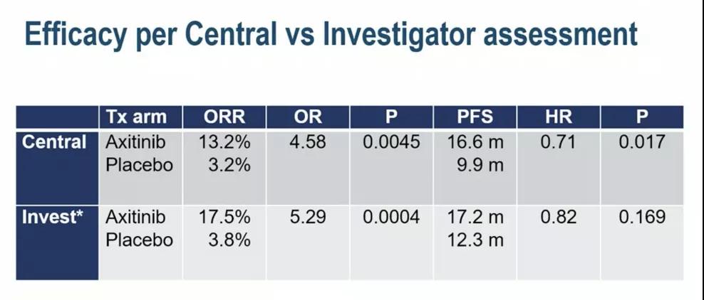 与安慰剂组相比,阿昔替尼组经独立放射学评估的ORR显著更高(13.2% vs 3.2%,P=0.0045);经盲法独立中心审查的PFS也显著更长(16.6 vs 9.9个月,HR 0.687,P=0.01)。安全性与先前报告(ASCO GI 2021)一致,毒性是可控的。