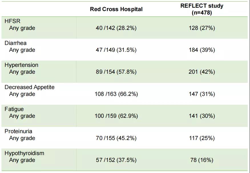 在不良反应方面,上述日本真实世界研究中的常见不良事件基本上与REFLECT研究一致,临床试验中最常见的是高血压(42%)和腹泻(39%),而真实世界中更常见的是疲劳(62.9%)和食欲减退(66.2%)。临床医生对这些不良反应的处理有相当丰富的经验,安全性值得肯定。
