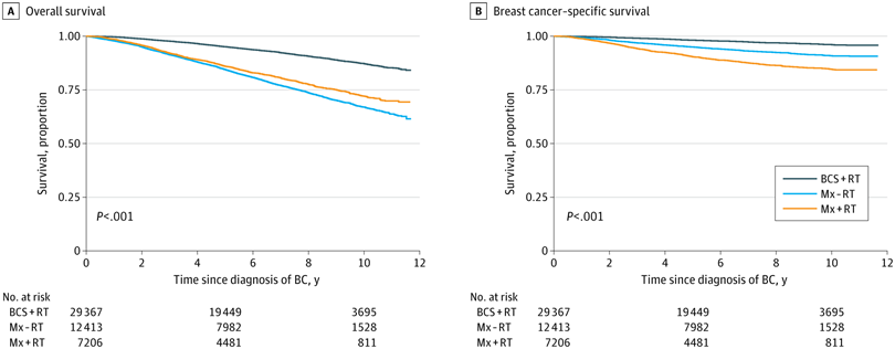图1.保乳术+放疗(BCS+RT)、仅行乳房切除术(Mx-RT)和乳房切除术+放疗(Mx+RT)患者的OS、BCSS情况