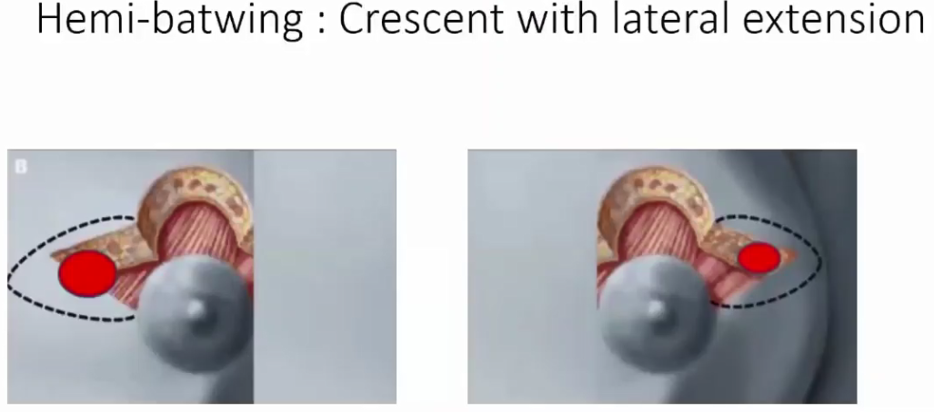 半蝠翼状乳房固定术(Hemi-batwing mastopexy)则在新月形固定术基础上,进一步扩展了纵向切口(见图5),适用于肿瘤靠近乳头上中部的患者,但瘢痕相对较大;蝠翼状乳房固定术则可允许更大、更深的切除范围,同样能轻度上提乳头乳晕,但适用于乳腺密度相对较大的患者。对肿物侵犯乳头、存在Paget病或乳头倒置的患者,保乳整形手术又有不同,例如肿物仅局限于乳头时,可仅切除并行荷包缝合,或对肿物行水平式/垂直式切除。