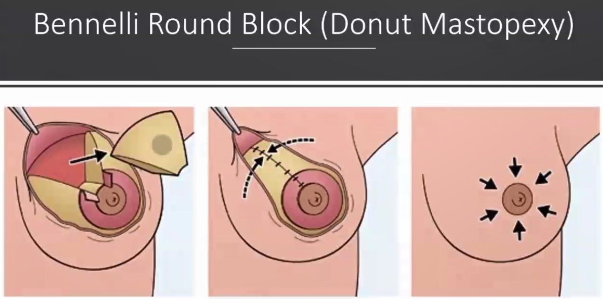 对临近乳头位置的肿物,可考虑行新月形皮肤皮下组织缝合(Crescent mastopexy),从而上提乳头乳晕的操作(见图4),从而更好地暴露肿瘤组织并切除,且术后乳房整体外表美观,但有着乳头内陷、双侧乳房不对称的缺点,因此可考虑对双乳均进行上提。