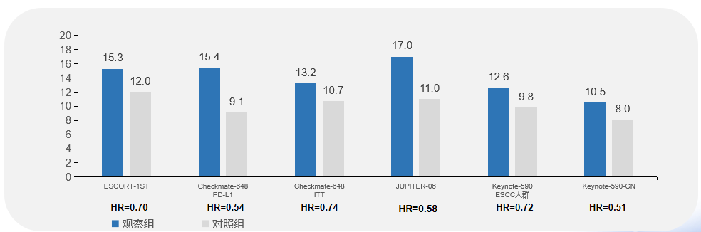 图1.晚期食管癌免疫联合化疗方案,临床III期研究中位OS数据汇总,JUPITER-06研究特瑞普利单抗17个月的中位OS为目前最长,较安慰剂组延长55%,患者死亡风险下降42%