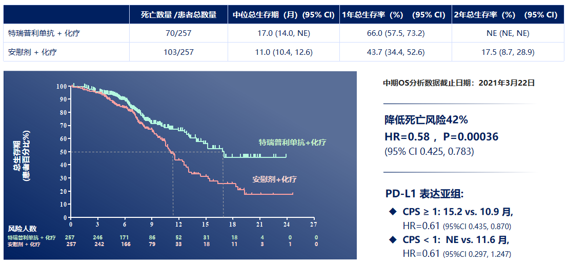 ■ 2)中位OS:特瑞普利单抗+TP vs. 安慰剂+TP,17.0个月vs. 11.0个月,HR = 0.58,P = 0.00036),1年OS率66.0% vs. 43.7%,特瑞普利单抗17个月的中位OS,以及较安慰剂组的相对延长幅度(6个月),均为目前晚期食管癌一线免疫治疗研究中的最佳数据;