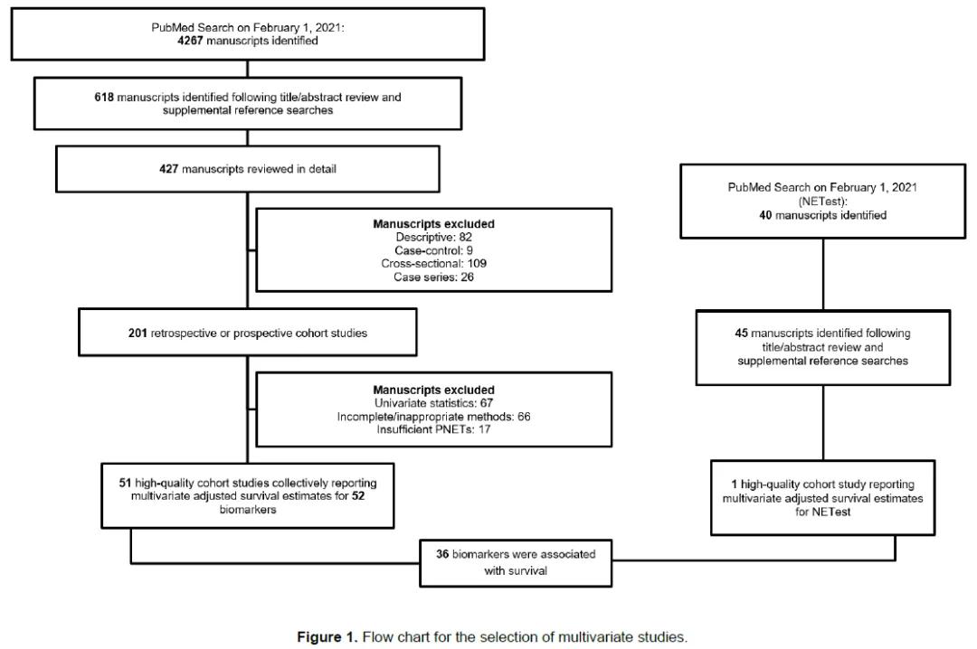 胰腺神经内分泌肿瘤(pNETs)是一个多样化的恶性肿瘤群体,具有组织学异质性和高度可变的临床结局。我们通过搜索PubMed数据库对pNETs的潜在预后生物标志物进行了系统回顾。共对472篇稿件进行了详细审查,有52项多变量研究符合 “肿瘤标志物预后研究报告建议 ”(REMARK)提出的纳入标准。这些研究总共分析了53个独特的靶点,其中36个与生存有统计学上的关联。
