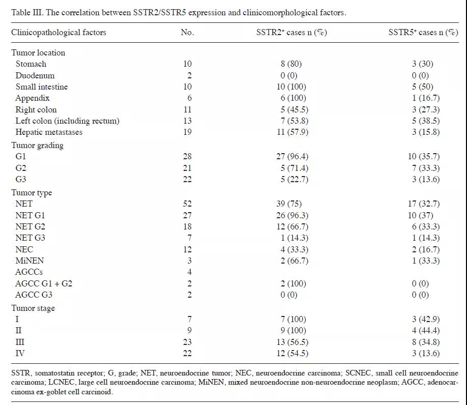 结果证明SSTR2表达的减少与增加恶性度和肿瘤分期相关。SSTR2在神经内分泌癌和腺癌前杯状细胞类癌中的阳性表达为生长抑素类似物治疗与手术和化疗相关的益处提供了证据。