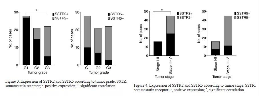结果显示,与G3癌相比,G1和G2神经内分泌肿瘤更常见SSTR2阳性(P < 0.0001)。此外,33.3%的神经内分泌癌和2例低级别腺癌前杯状细胞类癌为SSTR2阳性。与高分化神经内分泌肿瘤相比,神经内分泌癌的SSTR2和SSTR5表达显著降低(分别为P = 0.0130;P = 0.0437)。肿瘤早期SSTR2表达为100%,多于晚期(55.6%;P = 0.0011)。