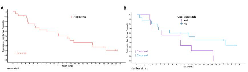 数据分析时,全组有57.4%的患者出现死亡事件,中位OS分别为20.4个月和24.3个月,差异无统计学意义,HR=1.03,P=0.89。两组ORR均为55%,DCR分别为90%和82%,DOR分别为14.5个月和16.6个月,差异均无统计学意义。两组最常见的新发转移部位均为肺(联合52.8%,单药44.2%),其次为骨(联合8.3%,单药18.6%)。
