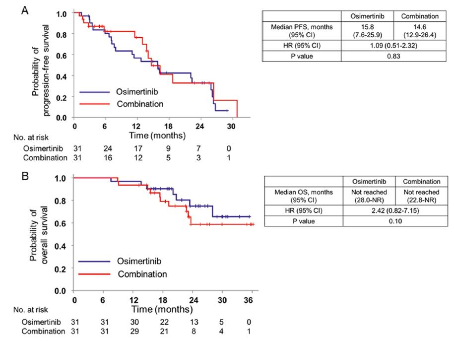 WJOG-8715L研究同样探索了奥希替尼与贝伐珠单抗联合后线治疗T790M阳性患者的疗效及安全性,并发表于JAMA Oncology杂志。令人惊讶的是,联合治疗组的疗效更差。在奥希替尼治疗的基础上联合贝伐珠单抗治疗,竟将疾病的进展风险提高了将近1.5倍。这项II期随机对照研究共纳入81例患者,联合治疗组和奥希替尼单药组分别入组40例和41例患者。中位PFS在联合治疗组和单药组分别为9.4个月和13.5个月 (HR 1.44,P=0.20),OS同样无获益,分别为未达到和22.1个月(P=0.96),两组ORR分别为68%和54%,联合治疗组展示了一定的优势。