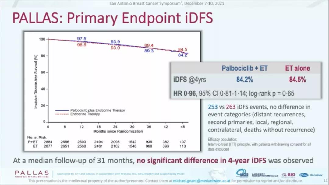[1] Mayer Erica L, Dueck Amylou C, Martin Miguel et al. Palbociclib with adjuvant endocrine therapy in early breast cancer (PALLAS): interim analysis of a multicentre, open-label, randomised, phase 3 study.[J] .Lancet Oncol, 2021, 22: 212-222.