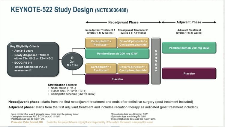 研究入组了未经治疗、无转移,经中心评估确诊的TNBC患者(AJCC分期:T1c N1-2或T2-4 N0-2),按2:1比例进行随机分组。pembro(200mg/Q3W)或安慰剂均联合紫杉醇+卡铂(4周期)+阿霉素或表阿霉素+环磷酰胺(4周期),术后患者接受辅助pembro或安慰剂治疗9周期或至复发或不可耐受的毒性。根据淋巴结状态(+ vs -)、肿瘤大小(T1/T2 vs T3/T4)和卡铂方案(Q3W vs QW)进行分层。主要研究终点是pCR(ypT0/Tis ypN0)和EFS。