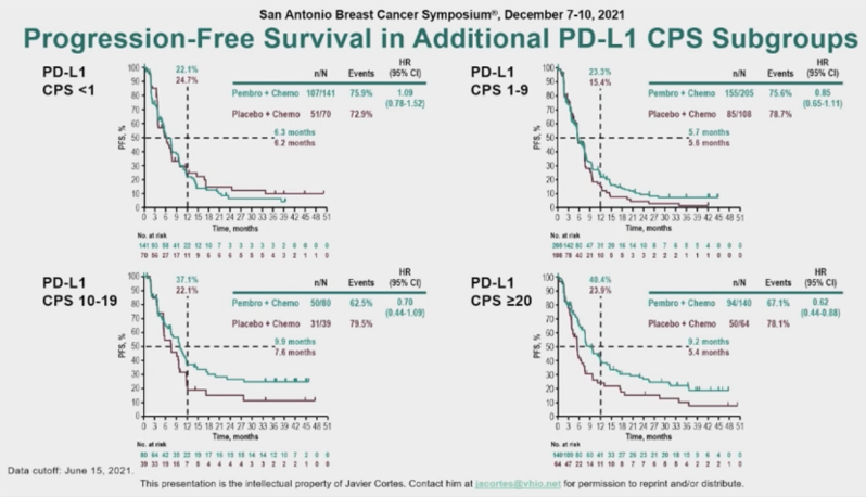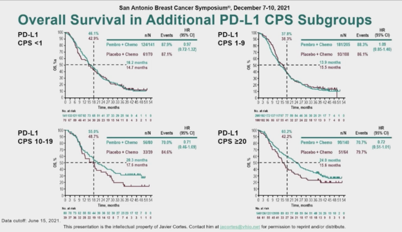 在Ⅲ期KEYNOTE-355研究(NCT02819518)中,与安慰剂+化疗相比,pembrolizumab(pembro)联合化疗(chemo)对既往未经治疗的局部复发、不能手术或出现转移的肿瘤表达PD-L1且CPS≥10的TNBC患者的OS和PFS有统计学意义的改善。在CPS≥1的人群中,治疗组之间没有统计学上的显著差异,而在ITT人群中,由于预先指定的检测策略,没有进行统计学上的显著性检验。在这里,我们将通过其他CPS临界值的亚组患者的结果与KEYNOTE-355的主要结果进行比较。