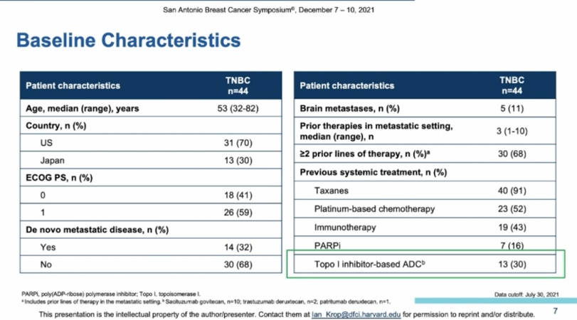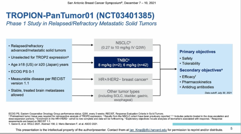 Datopotamab deruxtecan(Dato-Dxd)是一种抗体-药物偶联物,由人源化抗TROP2 IgG1单克隆抗体通过稳定的四肽连接子有效载荷拓扑异构酶Ⅰ抑制剂形成。TROPION-PanTumor01研究第一阶段结果表明Dato-Dxd在非小细胞肺癌(NSCLC)(Meric-Bernstam, ASCO 2021)和三阴性乳腺癌(TNBC)(ardia, ESMO BC 2021)中具有良好的抗肿瘤活性和安全性。此次汇报的是TNBC队列更新的结果。