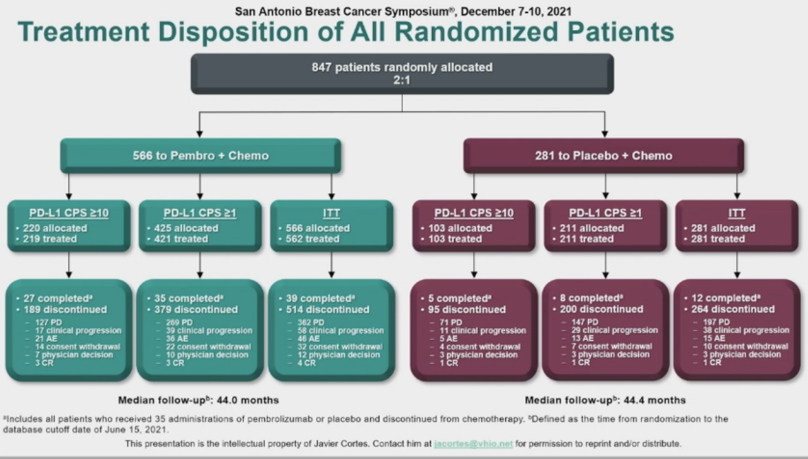 该研究共纳入了847例未经治疗的转移性或初治的局部复发不可手术的mTNBC患者,ECOG评分为0-1分,DFI≥6个月。按照2:1的比例随机分配接受pembrolizumab(200mg q3w)+化疗(白蛋白紫杉醇100mg/m2 d1,8,15 q4w,或紫杉醇90mg/m2 d1,8,15 q4w,或吉西他滨1000mg/m2 d1,8 q3w/卡铂AUC= 2 ,d1,8 q3w)或安慰剂+化疗(剂量同研究组),至多给予35周期pembrolizumab或安慰剂,直至出现疾病进展或无法耐受的毒性。根据化疗类型(紫杉类vs吉西他滨/卡铂)、PD-L1状态(CPS≥1 vs<1)和之前(新)辅助治疗化疗方案是否相同(是vs 否)对患者进行分层。主要研究终点是PD-L1阳性患者(CPS≥10和≥1)和所有患者的PFS和总生存(OS)。其他CPS亚组的风险比(HRs)和95%CIs基于未分层Cox模型。