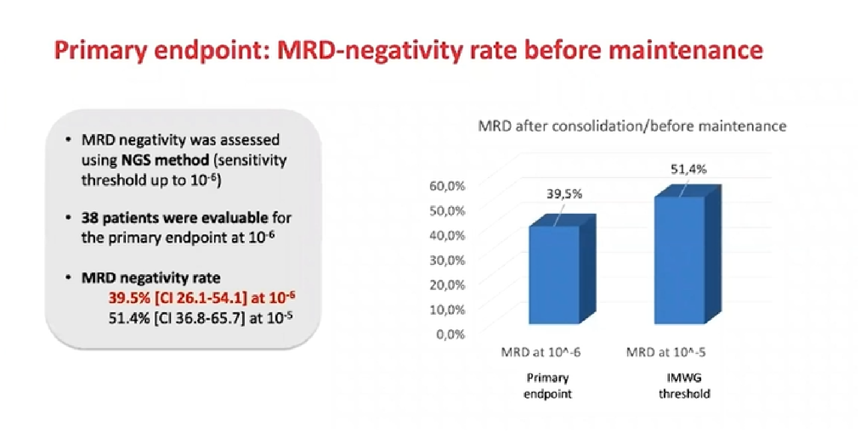 这次在美国血液学年会还报告了一项Ⅱ期临床研究,用达雷木单抗(Daratumumab)、伊沙佐米(Ixazomib)联合来那度胺和地塞米松(DIRD)治疗一线标危、适合移植的新诊断多发性骨髓瘤患者的疗效(大会摘要号:464)。