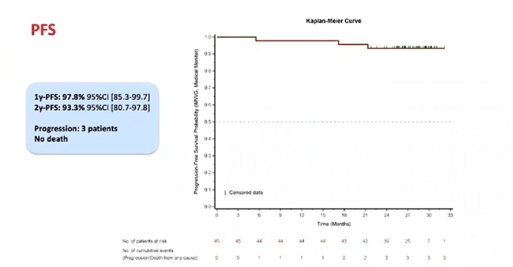 中位治疗时间是7个月,对比较脆弱的患者,两药联合还是可行的,整个有效性包括MR(微小缓解)以上的患者达86%,VGPR以上疗效的患者占33%。安全性方面也非常好,3级以上的不良反应占一半,主要常见的还是血液学毒性,包括血小板减少、粒细胞减少、感染等,不良事件的风险还是较低的。因此,针对老年脆弱患者,达雷木单抗联合伊沙佐米是非常可行的方案。