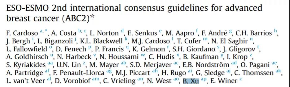 目前,徐兵河院士已经连续参加了ABC 2、3、4、5、6共识指南的制订。此外,徐兵河院士还担任St. Gallen早期乳腺癌治疗国际专家共识指南团成员、ESMO和ESO(欧洲肿瘤学院)核心成员(Faculty member)。