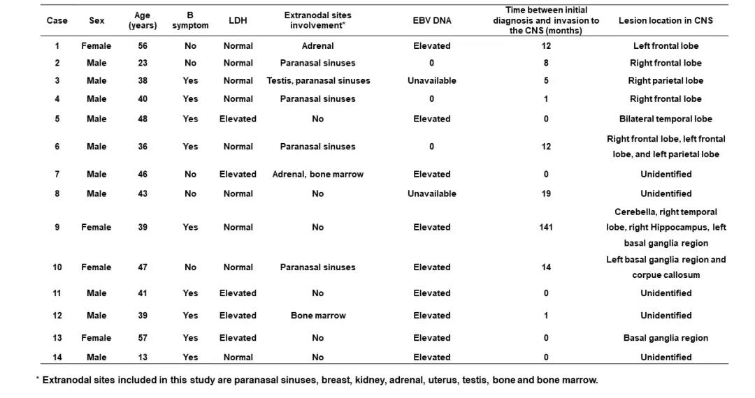 表1、NTKCL中枢神经系统侵犯患者的基本特征